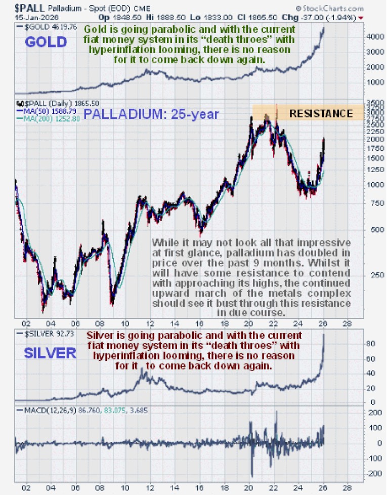 With a massive metals bull market in full swing, it’s always worth us stepping back from time to time to review the Big Picture. The background to all this is of course the accelerating collapse of the current fiat money system in the face of hopeless intractable mountains of debt with the “can kicking” enabled by derivatives etc coming to the end of the road as the amounts of new money required to just maintain the status quo accelerate into the infinite. The result will be hyperinflation that will render most fiat currencies utterly worthless. Small wonder then that the prices of assets with intrinsic value such as all metals and especially the Precious Metals are accelerating into a vertical meltup. In this environment an overbought condition becomes meaningless as the metals become overbought and stay overbought although of course they will hit occasional turbulence during their ascent along the way. So we will now proceed to see how the main metals bull markets are unfolding.