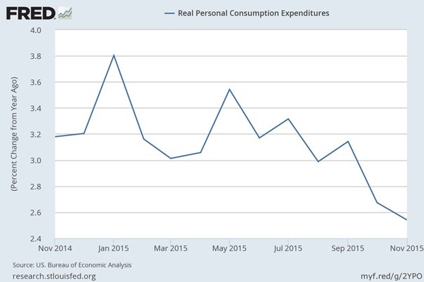 US consumer spending rose 0.3 percent in November. What does it mean for the gold market?Consumer spending rebounded in November after edging up 0.1 percent in October, in line with expectations. However, the annual pace of growth of personal consumption expenditures has been slowing down in 2015 (see the chart below). The sluggishness of consumer spending is the reason why the GDPNow model forecast for real GDP growth in the fourth quarter of 2015 fell from 1.9 percent to 1.3 percent after the personal income and outlays release.