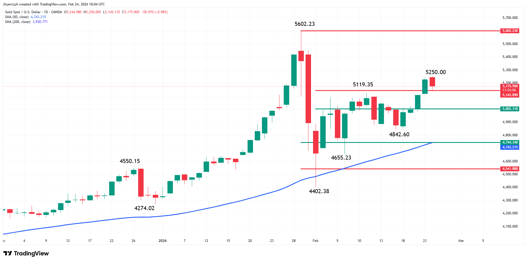 LONDON (February 24) Gold is edging lower on Tuesday after retreating from its highest level in a month. The early price action suggests a four-day rally may be at risk. With uncertainty building over President Trump’s tariff plans and the U.S. dollar strengthening, it looks as if profit-taking is weighing on prices today.